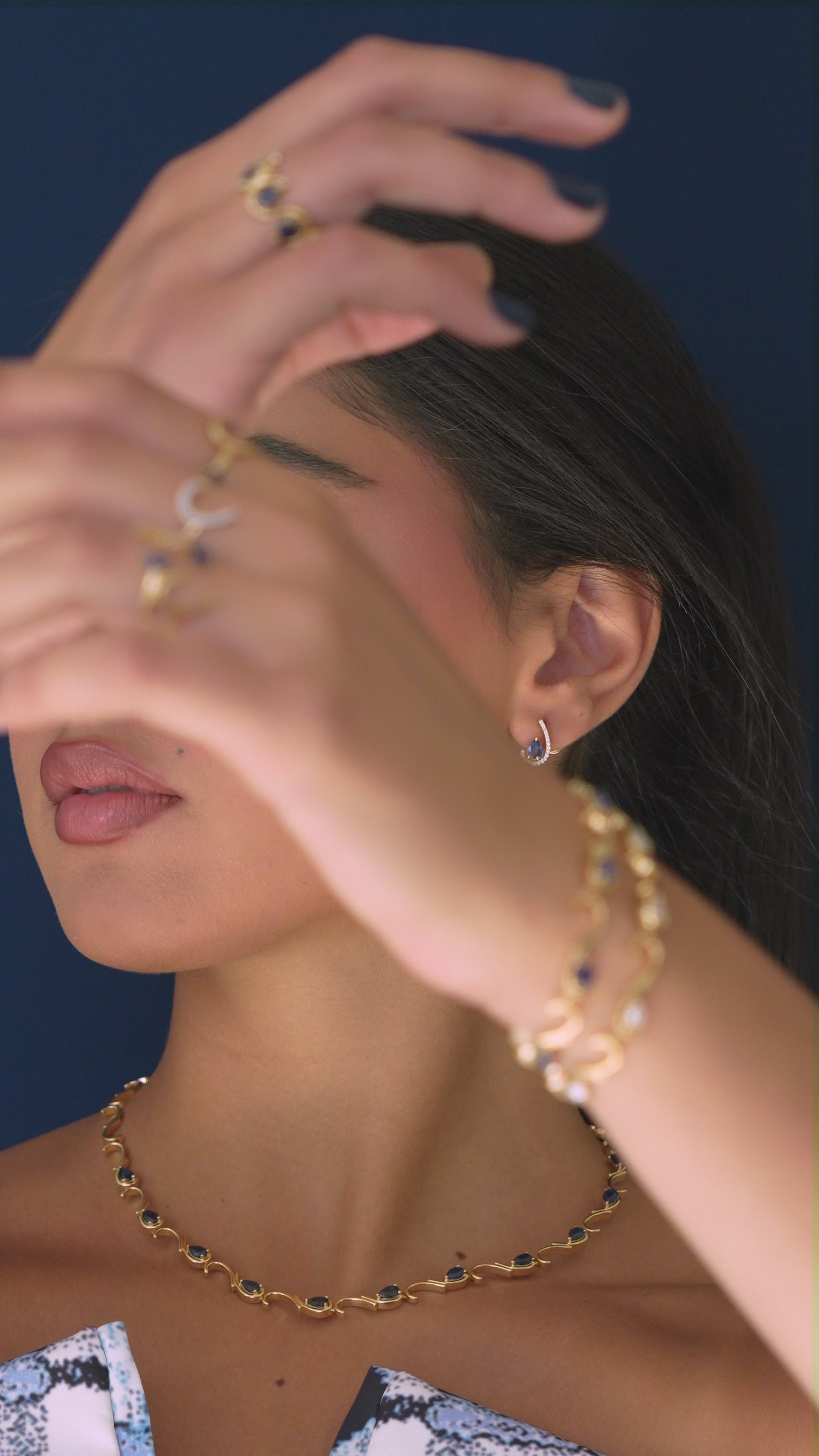 An elegant symbol of serenity and everlasting love, this necklace features connected half-heart motifs in smooth 18K gold, each cradling a pear-shaped sapphire for a refined and timeless look.